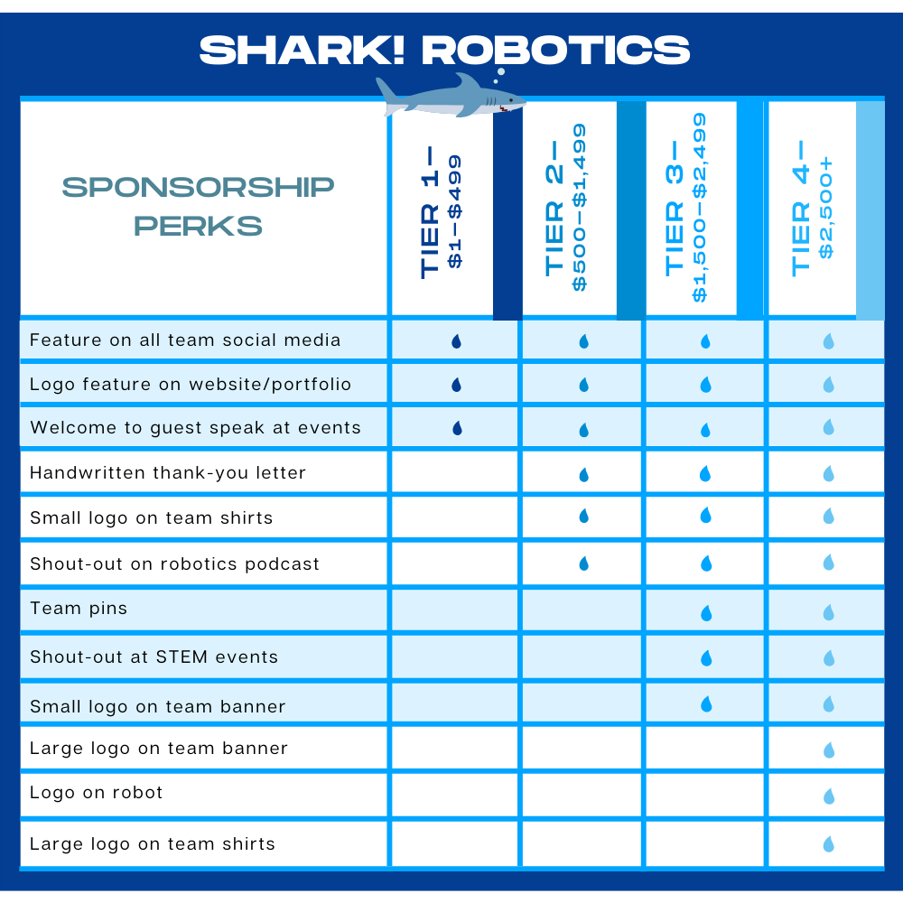 Every sponsor, no matter the size of the donation, will receive a variety of perks to demonstrate our appreciation. When you sponsor us, you are supporting a group of young, aspiring students who hope to involve themselves in a STEM career.